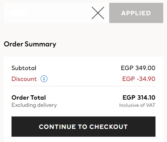 - عند الاستقرار على المنتجات يتم الضغط على شراء وبمجرد ظهور الخانة الخاصة بالخصم يتم لصق كود الخصم بها.